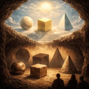 Platon privea în sus. Lumea adevărată era, pentru el, dincolo de ceea ce putem vedea — într-un tărâm invizibil al Formelor, al Ideilor perfecte, al Binelui suprem.