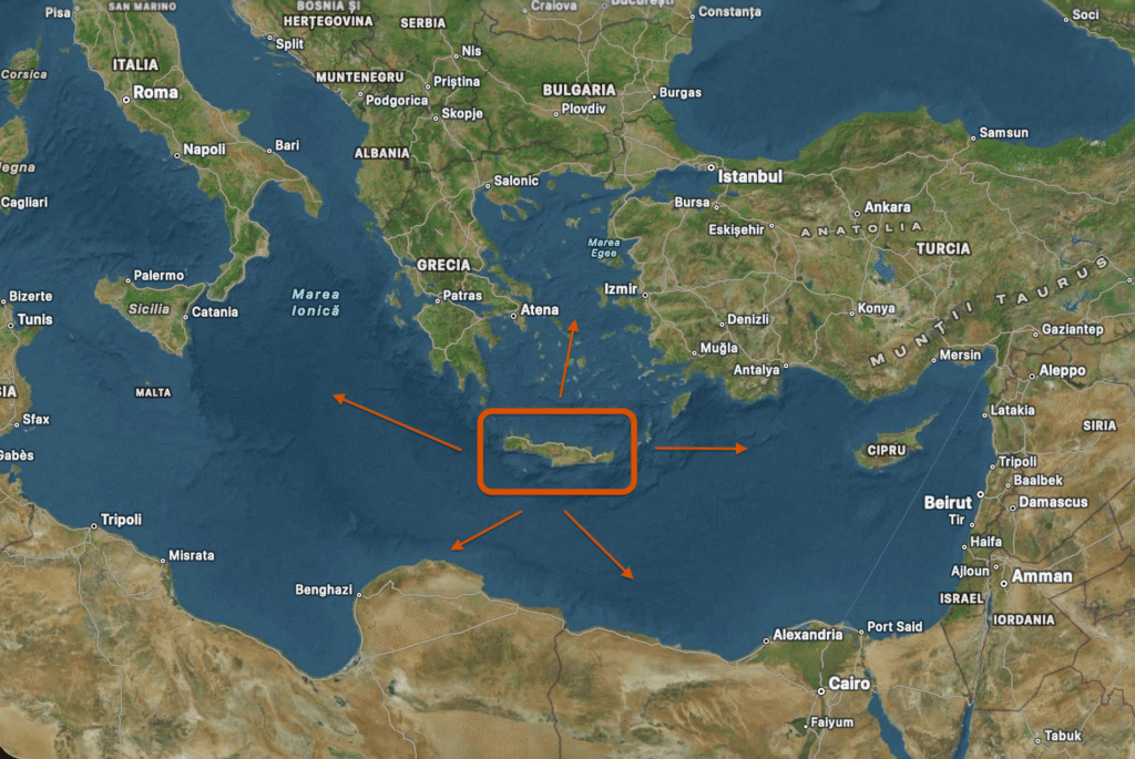 Poziția geografică a insulei era una excepțională: situată între Grecia continentală, Anatolia, Levant și Egipt, Creta nu era un loc izolat, ci un adevărat nod de legătură între marile lumi ale epocii.