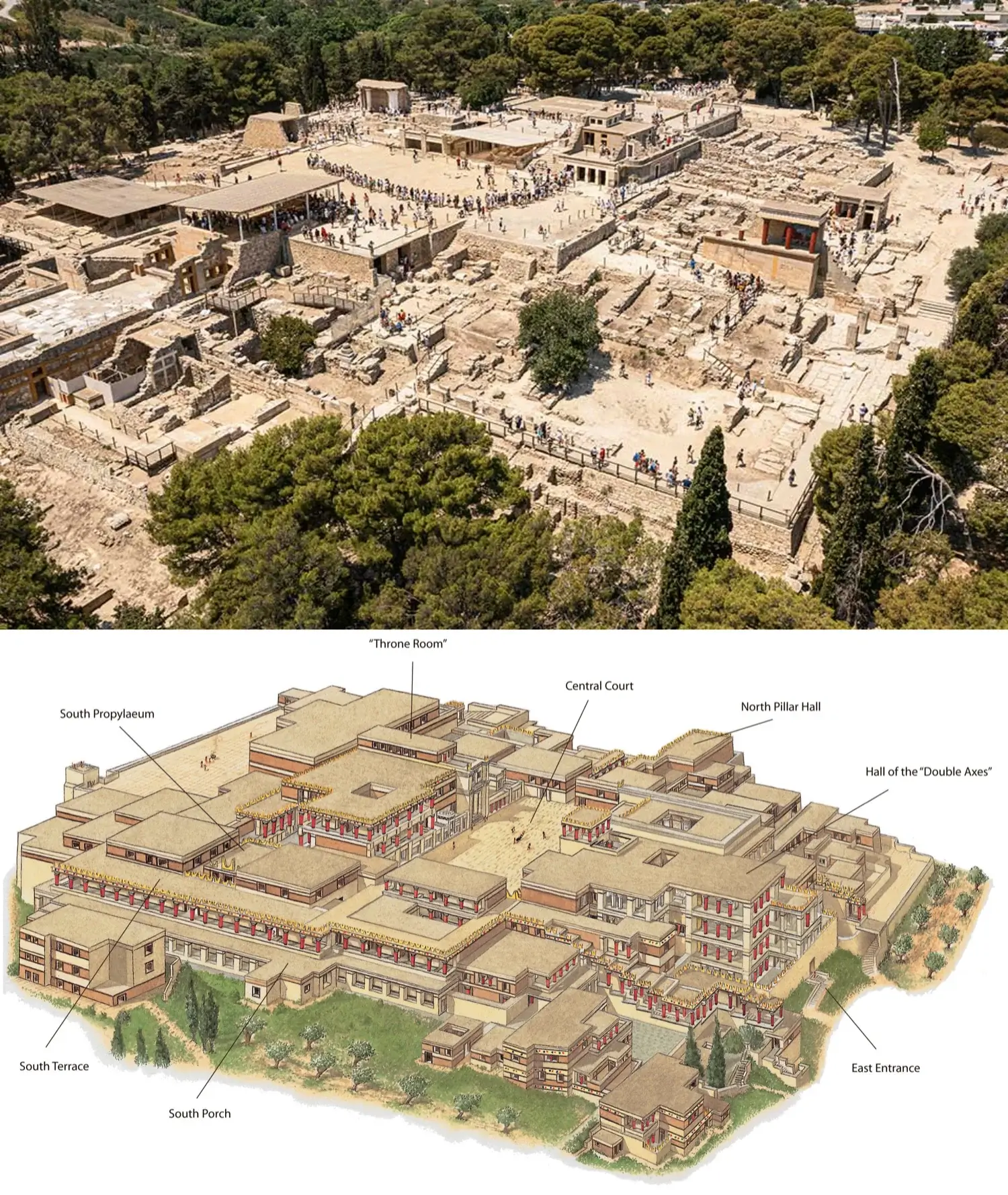 În centrul acestei civilizații se aflau palatele, adevărate nuclee în jurul cărora gravita întreaga viață politică, economică și religioasă. Dintre toate, Knossos era cel mai cunoscut și, probabil, cel mai important dintre acestea, funcționând atât ca centru administrativ, cât și ca simbol al puterii.