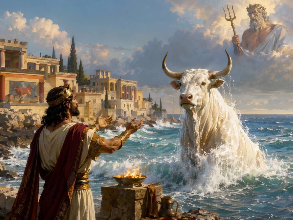 Crescut de regele Cretei, Minos a moştenit tronul şi a cerut zeului Poseidon un semn al legitimităţii sale divine: un taur alb din mare pe care să îl sacrifice în onoarea zeului. Poseidon a trimis taurul.