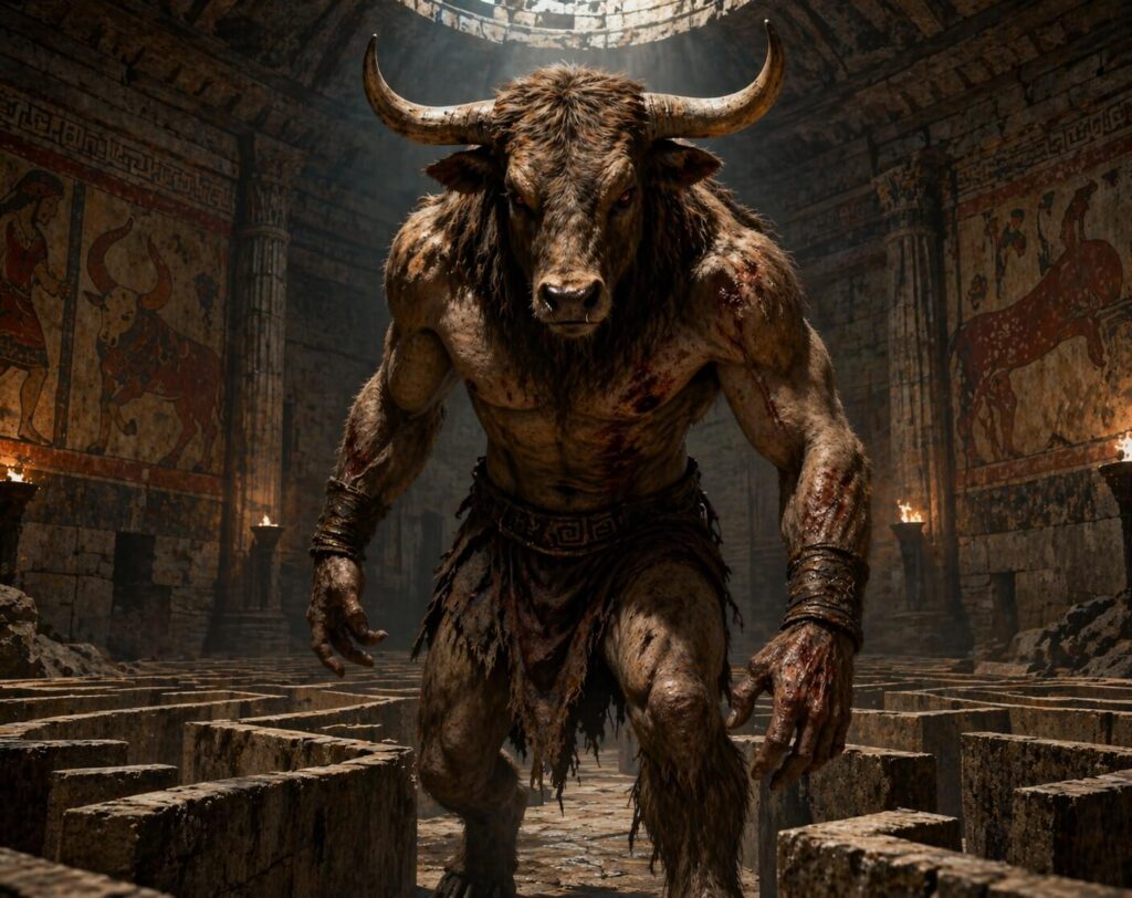 Minos, fascinat de frumusețea animalului, a decis să-l păstreze și să sacrifice altul în loc — iar zeii, care nu iartă ușor atunci când sunt înșelați, l-au pedepsit într-un mod indirect: Poseidon a făcut-o pe Pasifae, soția regelui, să se îndrăgostească de taur, iar din această unire monstruoasă s-a născut Minotaurul, o creatură cu trup de om și cap de taur, care nu se hrănea cu grâne sau plante, ci doar cu carne umană.
