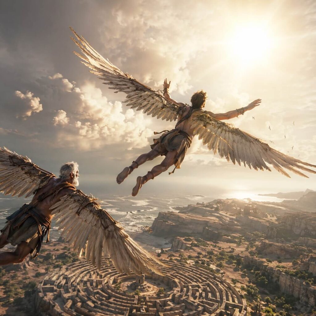 Pentru a scăpa, Dedal a găsit o soluție pe care Minos nu o putea controla: cerul. A adunat pene de diferite mărimi și le-a prins cu ceară, construind două perechi de aripi.