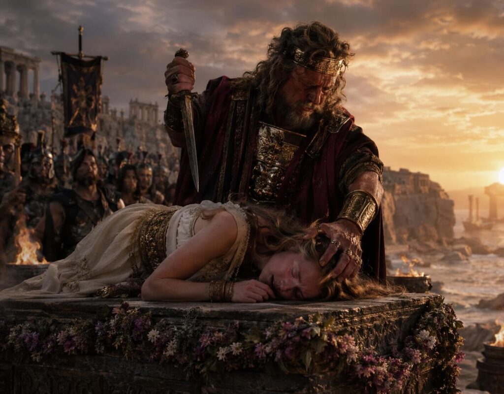 Agamemnon nu a moștenit doar tronul Micenei, ci și blestemul familiei sale — o povară care îi urmărea pe Atrizi din generație în generație. Înainte de a pleca spre Troia, și-a sacrificat propria fiică, Ifigenia, pentru a obține vânturi favorabile flotei, la cererea zeiței Artemis, pe care o ofensase și care oprise vânturile în portul Aulis; un gest pe care soția sa, Clitemnestra, nu avea să i-l ierte niciodată.