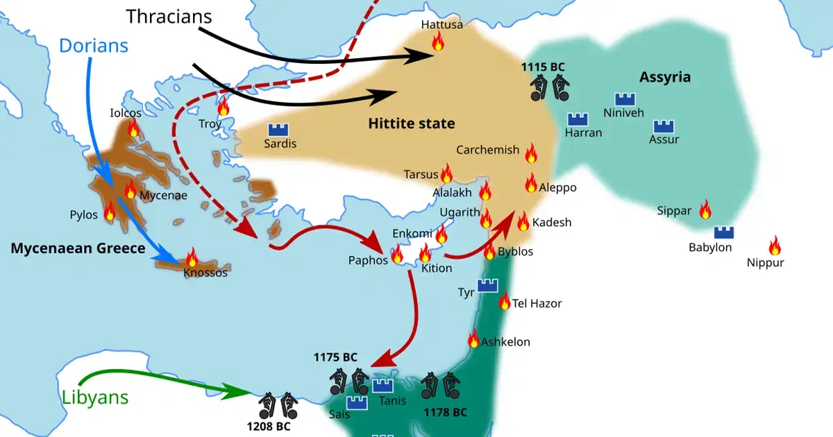 La sfârșitul Epocii Bronzului, însă, întreaga regiune a intrat într-o perioadă de criză. În jurul anului 1200 î.Hr., lumea est-mediteraneană a fost zguduită de un colaps general: invazii ale dorienilor în Grecia, migrațiile așa-numitelor „popoare ale mării”, prăbușirea rețelelor comerciale și slăbirea marilor imperii ale vremii, inclusiv Imperiul Hittit.
