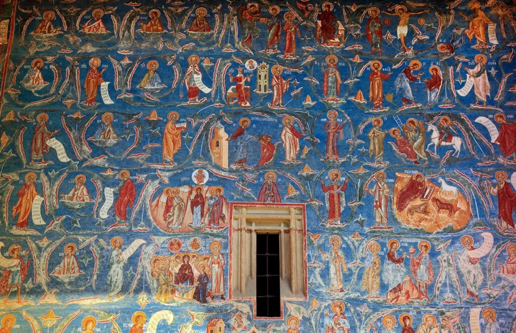 Bisericile pictate din nordul MoldoveiVoroneț, Sucevița, Moldovița, Humor —, înscrise astăzi în Patrimoniul UNESCO, sunt poate cel mai spectaculos exemplu de sinteză între tradiția bizantină și geniul local: aceeași iconografie, aceleași programe teologice vizuale, aceeași hieratică solemnitate a figurilor sacre ca în mozaicurile de la Ravenna sau frescele din Cappadocia — dar exprimate cu o culoare, o vivacitate și o poezie vizuală care nu seamănă cu nimic altceva din lumea creștină.